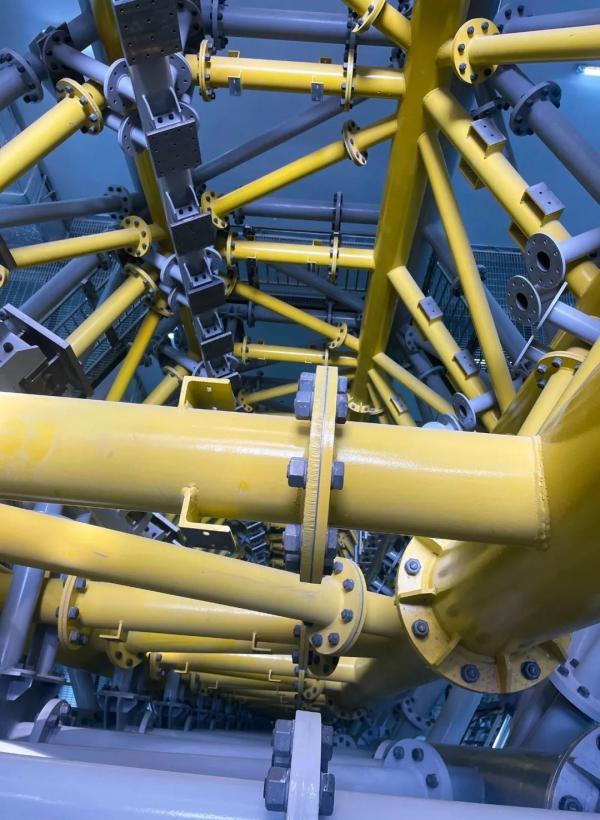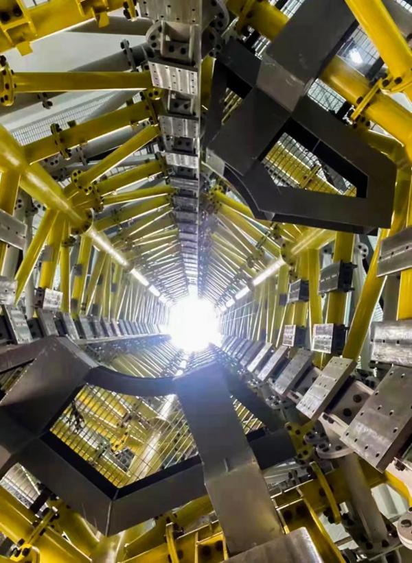 该工程融合了建筑安装和机械加工相关技术标准要求,施工技术与质量标准要求极高,常规施工方法和工艺难以保证。项目内塔采用正六边形双层钢支撑筒结构,内塔外层为轨道塔,内层为电机塔,“双塔”地下3米,地上37.026米,总高为40.026米。由6根钢柱支撑,分布在不同直径的圆上。电机塔与轨道塔钢结构构件加工、制作及安装过程中与普通钢结构工程有本质上的区别。