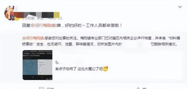 5月17日凌晨,有网友发文称,上海空气中飘出咖啡味,据说是闵行区普乐新村附近的一香精加工厂爆燃,导致风向沿路地区有股劣质咖啡味。多家媒体报道,闵行区环境保护局工作人员称,已进行排查,但目前在闵行区内未发现有异常。网传的加工厂爆燃消息不实,目前闵行区内除保供企业,普通工厂均未复工。5月17日中午,普乐新村所处的闵行区梅陇镇在官方微博回复网友称,镇相关部门已对辖区内相关企业进行排查,并未有“材料爆燃事故”发生,也无破坏、泄漏、异味等情况。