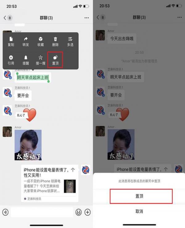 在群聊的聊天界面中,只有群主或者群管理可以置顶群聊消息,长按需要置顶的消息,在菜单中点击“置顶”即可对消息进行置顶。群管理也可以置顶自己发送的内容。