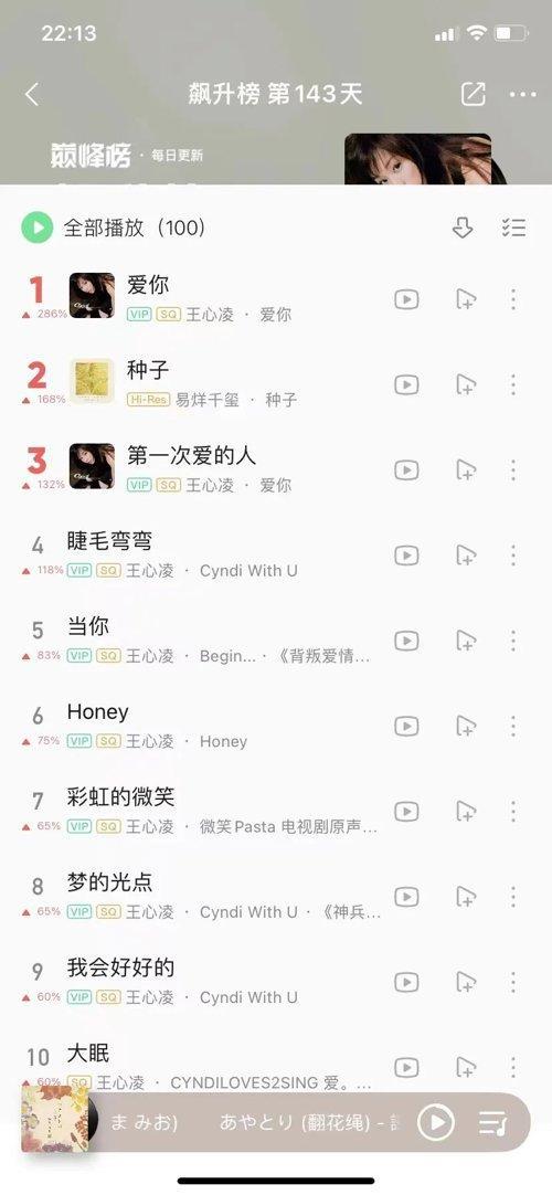 截至发稿,QQ音乐的榜单中,前十大热门歌曲中,有9首都是王心凌的歌曲。