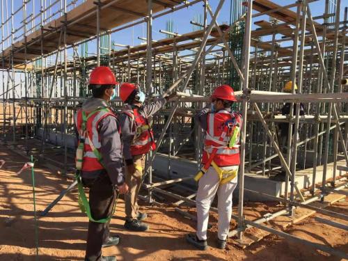 在进入施工现场前,项目部还将国内班前教育模式带到沙特,并创新加入班前早班环节,“百人”齐开安全早班会,提高工人的安全意识与能力。在施工中,项目部采取了很多有效措施最大限度保障安全。在当地临边防护的基础上,加设了标准化防护栏杆;脚手架通道口安装悬挂红、黄、绿牌,按50个作业工人配置一个安全员进行安全管理,坚决阻拦无关人员、PPE佩戴不齐全人员进出脚手架进行作业,保障六个站点来自中国、巴基斯坦、印度、孟加拉、尼泊尔等八百多现场劳务人员作业安全……