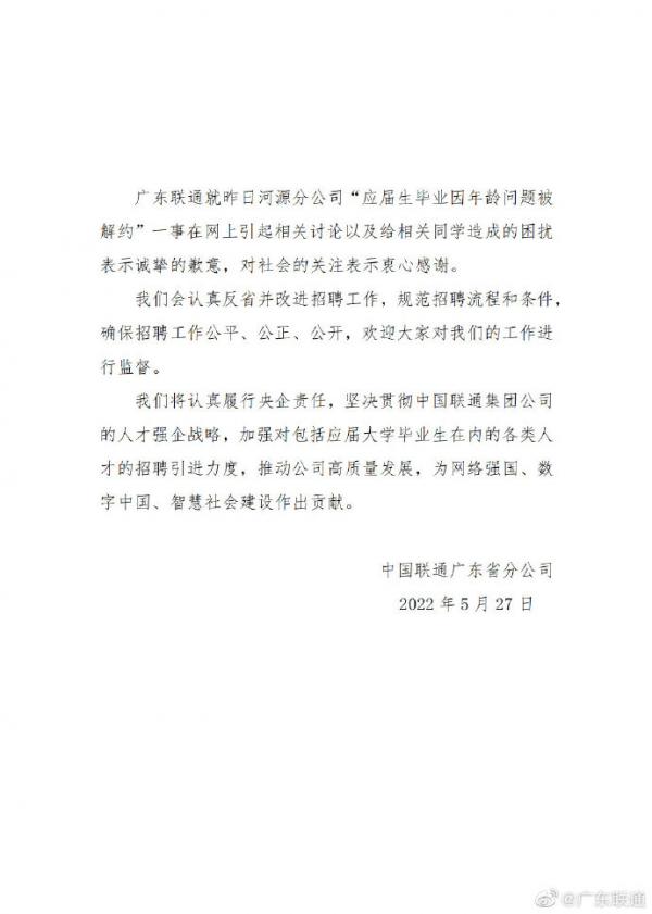 中新经纬5月27日电?27日,话题#应届生因毕业年龄超24岁被中国联通解约#冲上微博热搜第一,话题阅读量超3亿。针对此事,涉事企业中国联通广东省分公司发声明道歉。