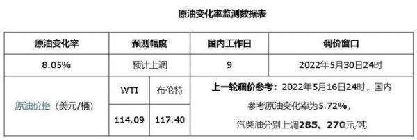 截止5月27日0时,本轮10个计价工作日已统计到第9日(本周末不计算),当前原油变化率为+8.05%,预计上调幅度350元/吨。在仅剩1个计价工作日的情况下,当前上调已大幅超过50元/吨调整红线,因此本轮油价上涨已是板上钉钉。