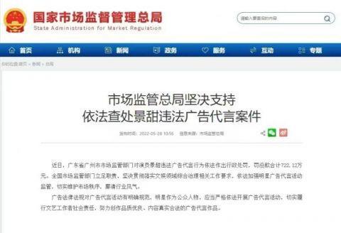 广州市天河区市场监管局依据《中华人民共和国广告法》第六十一条的规定,对景甜违法广告代言作出没收违法所得257.9万元、罚款464.22万元(罚没金额合计722.12万元)的行政处罚决定。此外,根据我国《广告法》相关规定,景甜3年内将不能代言广告。