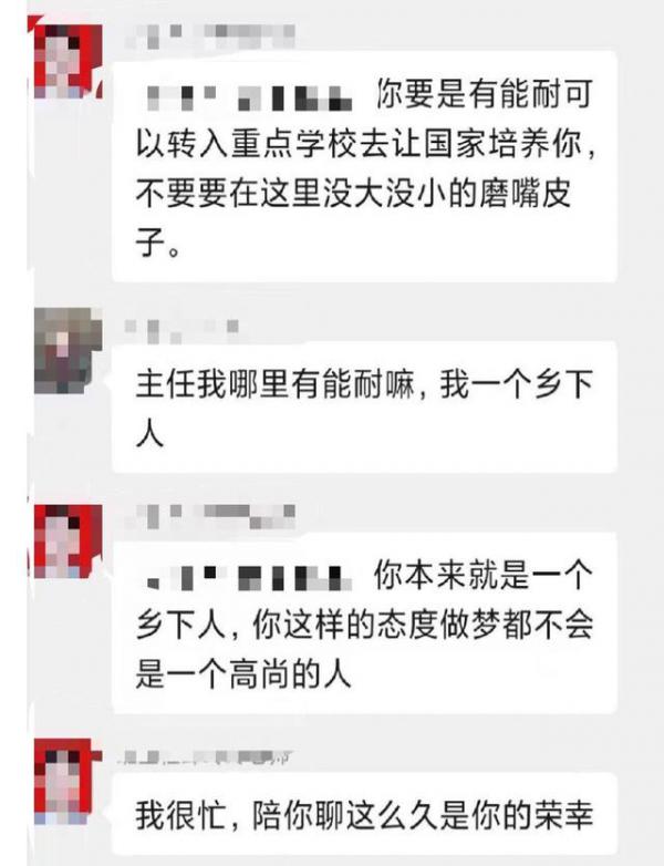 近日,一则班级群的聊天记录在网络上传播。聊天记录显示,一名班主任老师在群里公开对家长表示:“不欢迎调皮捣蛋的学生”,并且还出言羞辱家长,称其“就是乡下人”。