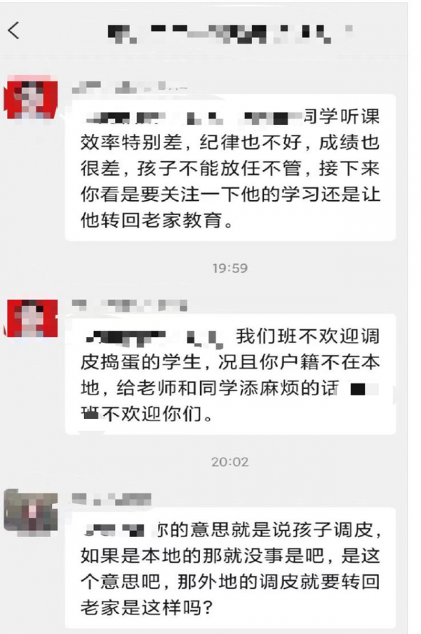 网传聊天截图展示,一名备注显示班主任的老师在班级群里公开艾特一名孩子的家长称她的孩子听课特别差,效率也不好,班级不欢迎调皮捣蛋的学生。不仅如此,该老师还出言羞辱家长:“况且你户籍不在本地,给老师同学添麻烦的话,班级不欢迎你们。”