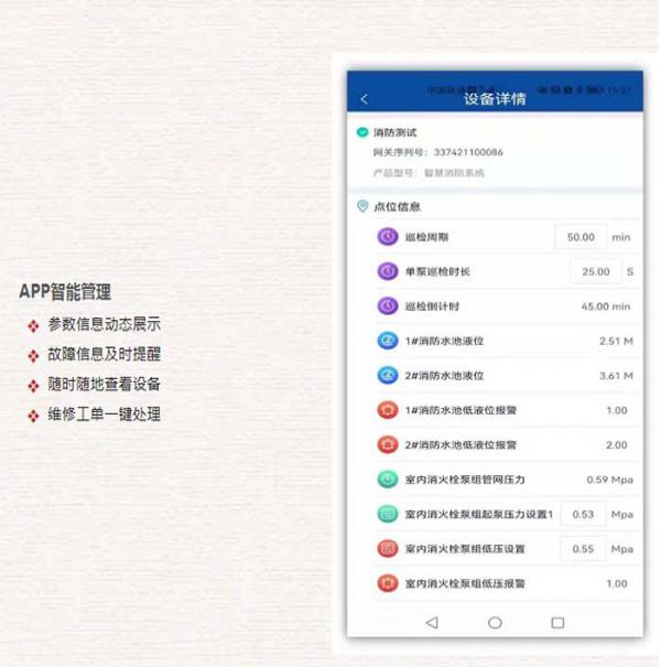 增压设备为一体化成套设备,包括专用物联网消防控制柜、消防水泵、管路、吸水阀组、出水阀组、工频巡检阀组和物联网消防专用仪表等。