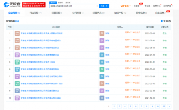 天眼查App显示,安徽老乡鸡餐饮股份有限公司成立于2003年10月,法定代表人束从轩,注册资本3.6亿人民币。该公司直接对外投资企业13家,其中1家已注销。此外,该公司分支机构近900家,存续在业的有640余家。据2021年年报显示,该公司缴纳社保人数为9500余人。