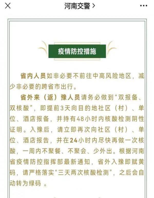 5月30日,河南交警微信公号发布消息称,根据河南省疫情防控指挥部最新通知,省外入豫即赋黄码,请严格落实“三天两次核酸检测”,之后会自动转为绿码 。省外来(返)豫人员请务必做到“双报备、双核酸”,即提前3天向目的地社区(村)、单位、酒店报备,并持有48小时内核酸检测阴性证明。入豫后,请立即再次向社区(村)、单位、酒店报告,并在24小时内尽快再做一次核酸,一周内不聚餐、不聚会、少外出。