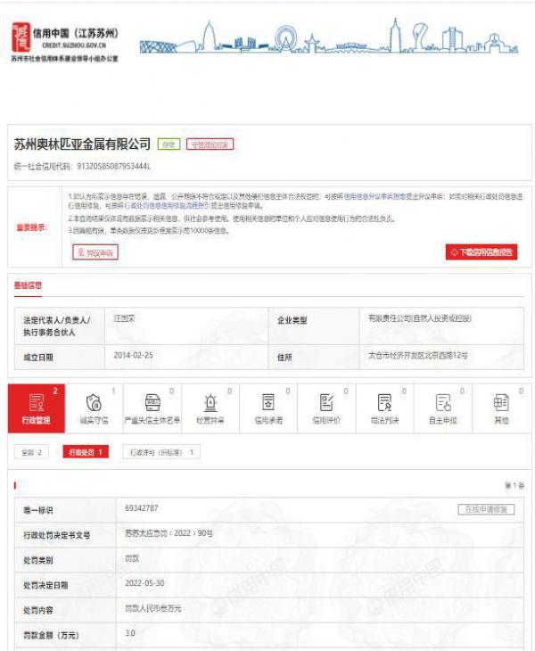 5月30日,太仓市应急管理局作出苏苏太应急罚﹝2022﹞90号处罚决定书,苏州奥林匹亚金属有限公司正在使用的 1台旋压机的传动装置未安装防护罩,生产经营单位安全设备的安装、使用不符合国家标准或者行业标准。(GB5083-1999生产安全设备安全卫生设计总则6.1.6),正在使用的空压机储气罐的 1个安全阀到期未校验,生产经营单位未对安全设备进行定期检测(TSG ZF001-2006安全阀安全技术监察规程 B6.3.1)。依据《中华人民共和国安全生产法》第九十九条第二项;《中华人民共和国安全生产法》第九十九条第三项,处罚款人民币叁万元的行政处罚。
