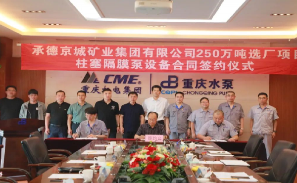 6月14日,重泵公司与承德京城矿业集团举行柱塞隔膜泵合同订单签约仪式。承德京城矿业集团有限公司副总经理李群力、李柱国、杨志新、采购部副部长张森,机电股份公司党委书记、董事长张福伦,重泵公司党委书记、董事长李方忠、党委副书记、总经理彭忠、副总经理潘志敏、何智奎参加活动。
