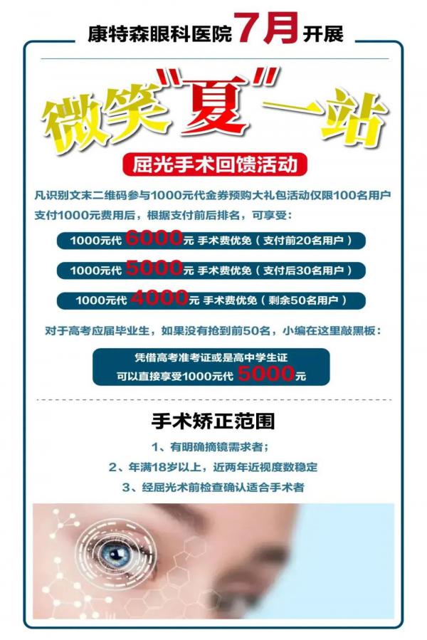 大家期盼的,昆明康特森眼科医院屈光手术中心早就替大家想到了。即日起推出重磅福利,康特森眼科医院7月开展:【微笑“夏“一站 屈光手术活动 】。到昆明康特森眼科医院屈光手术中心做飞秒类激光手术可享受多重优惠福利(具体活动形式,请见下方海报)。