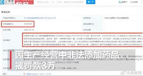 近日,浙江一家健康管理有限公司宁波分公司因生产经营中非法添加药品,被罚款3万。据悉,当事方为一家月子会所。