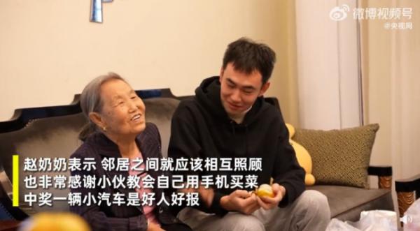 近日,杭州一小伙在给邻居老人演示手机买菜时中奖一辆小车。