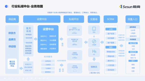 希尚私域产业PaaS中台是在企业私域(社群团购、视频号分销、代理商管理)全流程解决方案之上,再次升级突破,建立行业私域产业互联解决方案,提供行业中台系统、供应链管理系统、全流程运营服务,助力打造私域S2BSb2C产业互联。