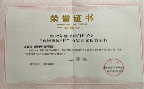 在2022年《阀门用户》“台湾捷流杯”征文活动中,由黄山良业智能控制股份有限公司终身名誉董事长项美根、总经理项晓明,湖南云箭集团有限公司陈可见三人撰写,发表在《阀门用户》杂志上的论文《阀门电动装置在小型水电站的新应用》荣获三等奖,并获业内专家学者的高度评价,评奖中专家学者的评语有: