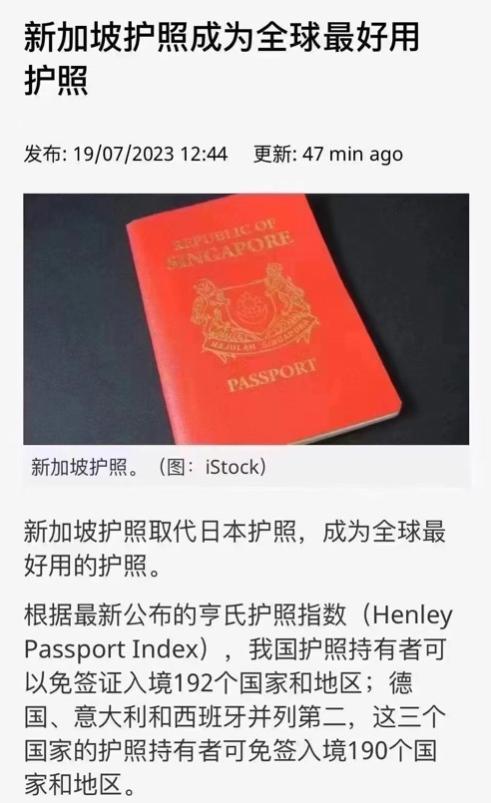 2023年7月18日,全球权威统计公布2023年最新版排行榜,关于凭护照无需签证即可前往的国家及地区数量,新加坡位列第一,获得192个目的地免签证待遇,超过了原先的第一名日本;而香港特区护照排名第17。