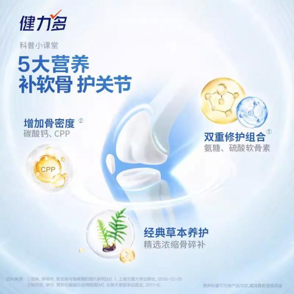 健力多蓝氨糖是汤臣倍健旗下品牌,依靠膳食营养补充剂大厂的综合实力,十年专研骨关节营养,为消费者提供中西合璧的五大营养素。健力多蓝氨糖不仅含有基础的氨糖、硫酸软骨素营养成分,还科学搭配了能促进钙吸收的酪蛋白磷酸肽CPP、补肾强骨的经典汉方骨碎补、硬骨营养素碳酸钙。健力多蓝氨糖用多样的营养成分,为软硬骨输送营养,为骨关节健康护航。