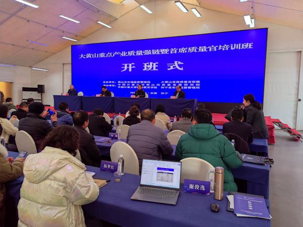 2024年12月16日,由黄山市市场监管局、大黄山首席质量官联盟主办,中国计量大学黄山高质量发展研究院、中国计量大学继续教育学院、休宁县市场监管局承办的大黄山重点产业质量强链暨首席质量官培训班在休宁县开班,黄山市市场监管局局长韩开云作开班动员,大黄山四市市场监管系统干部、有关企业负责人和企业首席质量官共100余人参加,我公司首席质量官谢俊逸也参加了这次培训活动。