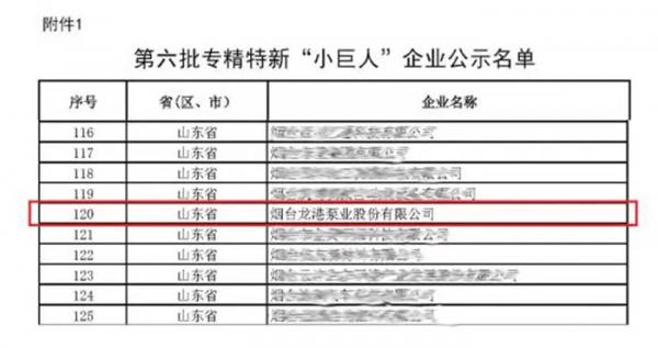 近日,山东省工业和信息化厅在官网公示了第六批专精特新“小巨人”企业和第三批专精特新“小巨人”复核通过企业名单。烟台龙港泵业股份有限公司(以下简称“龙港泵业”)成功入选,并被认定为第六批*专精特新“小巨人”企业。
