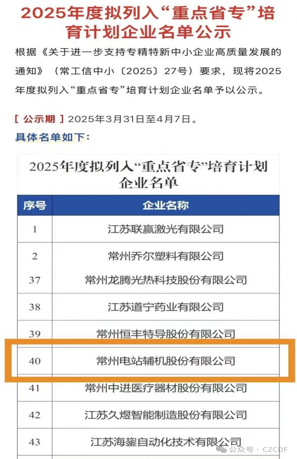 近日,2025年度“江苏省重点专精特新中小企业”培育名单正式公布,常州电站辅机股份有限公司荣登榜单。这一入选不仅意味着公司在专业化、精细化、特色化、新颖化发展方面取得了显著成效,也标志着企业迈入更高层次的发展通道,朝着“*小巨人企业”目标迈出了坚实一步。