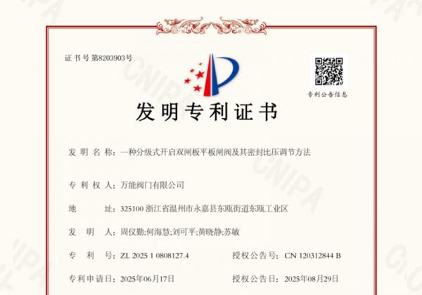 近年来,万能阀门有限公司坚持以市场需求为导向,以技术创新为核心驱动,持续在平板闸阀的研发领域加大投入。公司不仅组建了一支经验丰富的研发团队,还建立了完善的试验检测平台,确保每一项新技术、新产品在投入市场前均经过严格验证。此次专利的获得,正是企业长期深耕技术积累与注重品质管理的成果体现。