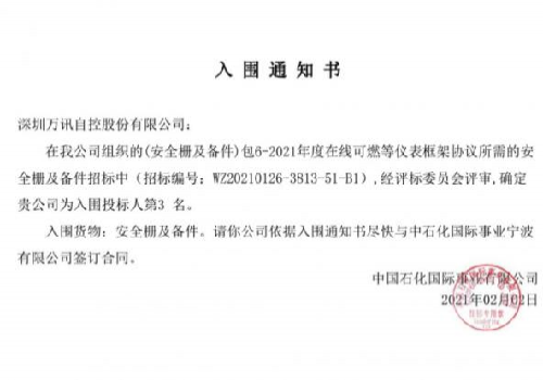 日前,中国石油化工集团有限公司(简称中国石化)组织了2021年度安全栅及备件仪表框架协议的招标,经评标委员会评审,确定万讯自控为入围中标人第3名。中石化是特大型石油石化企业集团,注册资本3265亿元人民币,是中国最大的成 [