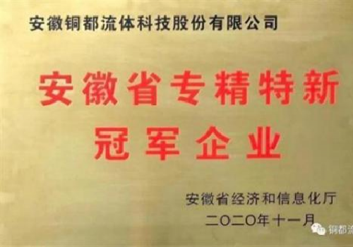 日前,据安徽省经济和信息化厅网消息,铜都流体荣获2020年度“安徽省专精特新冠军企业”称号。专精特新冠军企业在补强产业基础和产业链短板、提高供给体系质量、挖掘企业和区域特有资源、促进重点领域产业业态创新等方面发挥标杆示范 [