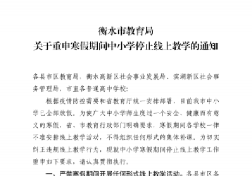 30日,衡水市教育局在其官方网站发布了《关于重申寒假期间中小学停止线上教学的通知》(以下简称《通知》),重申寒假期间中小学停止线上教学活动。《通知》指出,根据疫情防控需要和省教育厅统一安排部署,目前衡水市中小学已经全部放 [